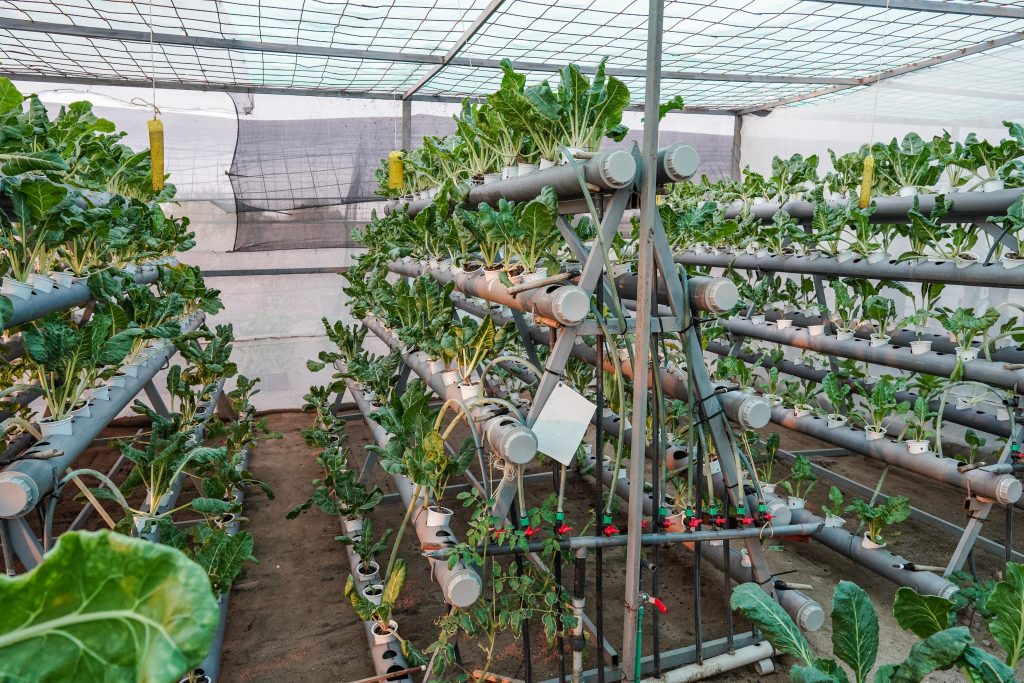 A hydroponic system inside a greenhouse on the premises of TBI.