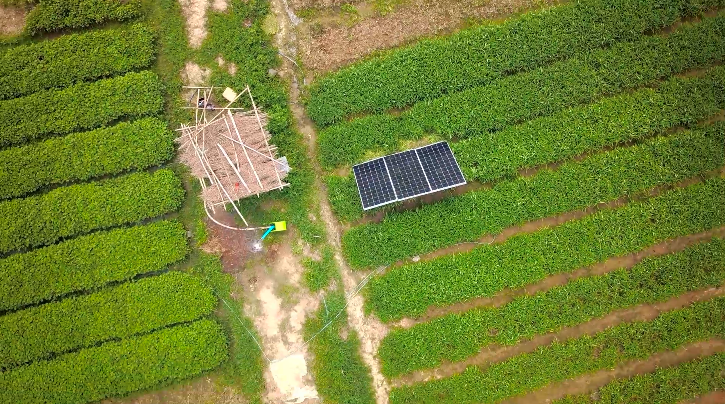 A solar-powered irrigation system installed in the field.