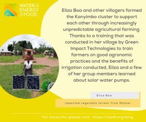 Eliza and a few of her group members learned about solar water pumps through a field extension meeting that was held in her village to train farmers on good agronomic practices and the benefits of irrigation. The training was conducted by Green Impact Technology (GIT) officers. GIT is one of the companies supported by WE4F which seeks to promote the adoption and use of innovative and sustainable agricultural solutions. Through joint contributions, Eliza and her group members purchased a solar water pump by paying an initial deposit and then through further scheduled payments – also payable in installments – once they received and utilized the pump.