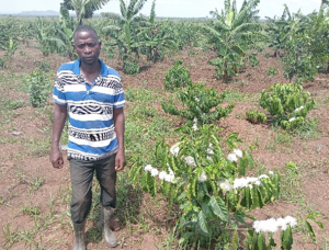 Joshua’s farm manager, Samson at the farm with the Arabica coffee plants.