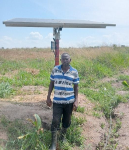 Joshua’s farm manager, Samson at the farm next to the solar panel array.