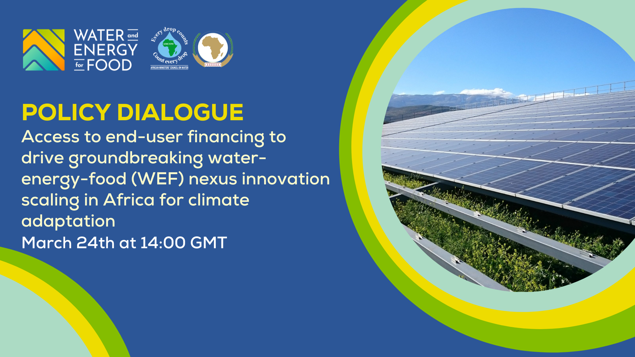To share current lessons learned and explore multiple points of view on end-user financing, WE4F is co-hosting a policy dialogue with AMCOW. The session, entitled “Policy dialogue: Access to end-user financing to drive groundbreaking water-energy-food (WEF) nexus innovation scaling in Africa for climate adaptation” brings together the four African Regional Innovation Hubs (East, West, MENA, and Southern and Central). By using a policy and investment lens, this session shares the opportunities and challenges for scaling WEF nexus solutions in Africa in a multi-partner, multi-innovator model.